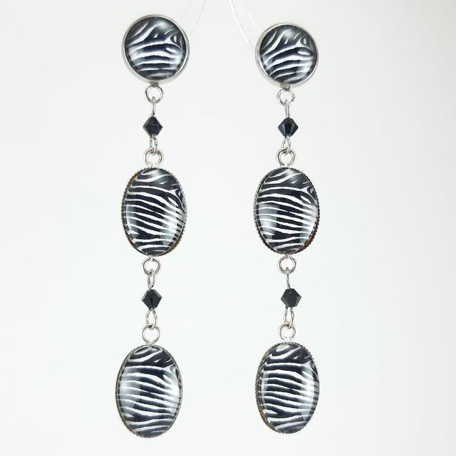 Boucles d'oreilles longues en laiton finition argenté ou bronze, ornées de plusieurs cabochons en verre décoré d'un motif " zèbre" noir et blanc.